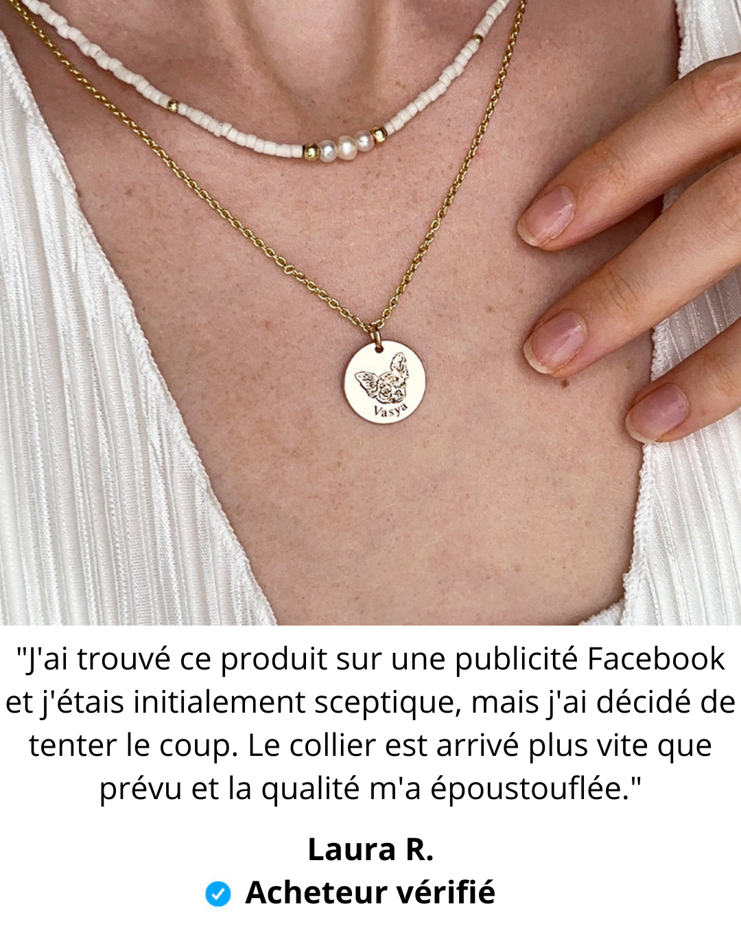Le collier est arrivé dans un joli emballage. La chaîne est solide et le pendentif très bien fini. J'ai commandé le modèle avec le visage de mon golden retriever, c'est parfait !